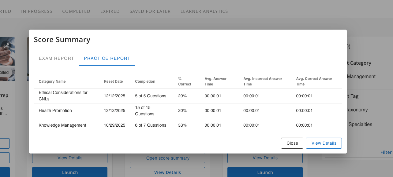 This view displays results in a familiar, tabbed layout and includes visibility into activity from both practice and exam reset results. Admins may also choose to display a “Last Attempt” line on the course tile, highlighting the learner’s most recent practice session or exam attempt, if Expose Last Attempt Data is enabled.