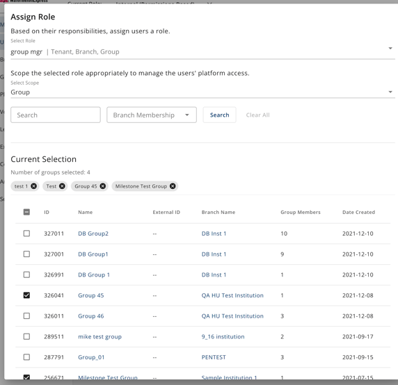 Previously, admins had to repeat the role assignment process for each individual group, branch, or content package. With this update, the role assignment dialog includes multi-select functionality, allowing admins to efficiently apply roles across multiple contexts at once.
